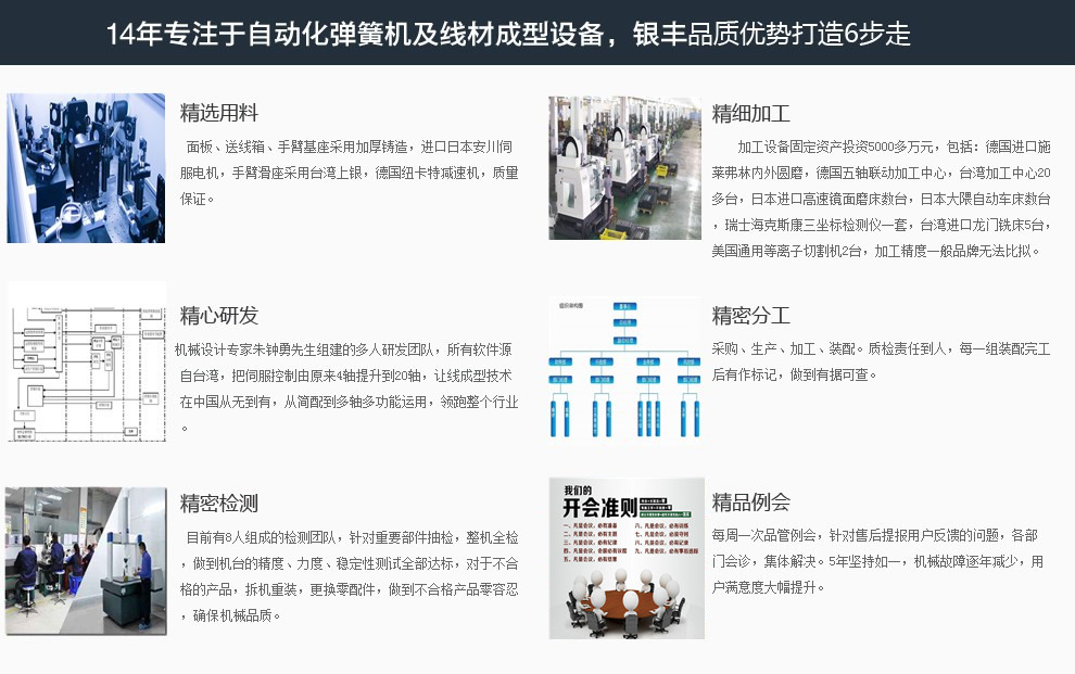 银丰自动化科技(杭州)有限公司2014年成立于浙江杭州。是中国浙江专业生产弹簧机及线材折弯机的技术型企业。2014年公司运用日本新先进的伺服系列控制技术,进行一次次具有重要意义的技术改革,打破传统的凸轮带动成型模式,成为浙江省内能够独立生产无凸轮模式兼备机械手的弹簧机及转线线材折弯机,目前公司每年销售各类机型7百余台,成为行业销量领先的企业,也因为高性价比被广大客户群体追捧,同时也受到部分友商的诋毁。